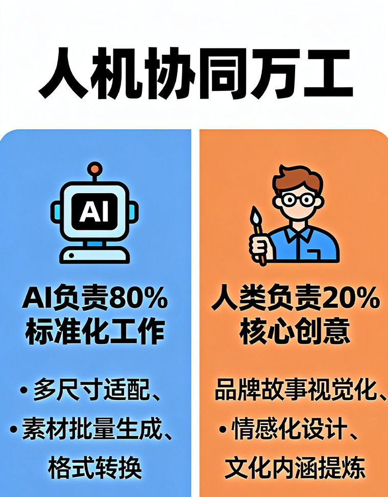 破局关键在于建立"人机协同"新范式:AI接管素材生成、格式适配等机械劳动,释放设计师专注于战略叙事与情感触点设计。2025年AI现状报告显示,采用"设计师主导+ AI辅助"模式的团队,创意效率提升150%的同时,品牌记忆点保留率反而提高23%。行业亟需构建三层保障体系:技术层开发可解释的生成模型,规范层建立AI素材版权登记机制,教育层培养兼具算法思维与人文洞察的"AI原生设计师",最终实现技术效率与人性温度的动态平衡。